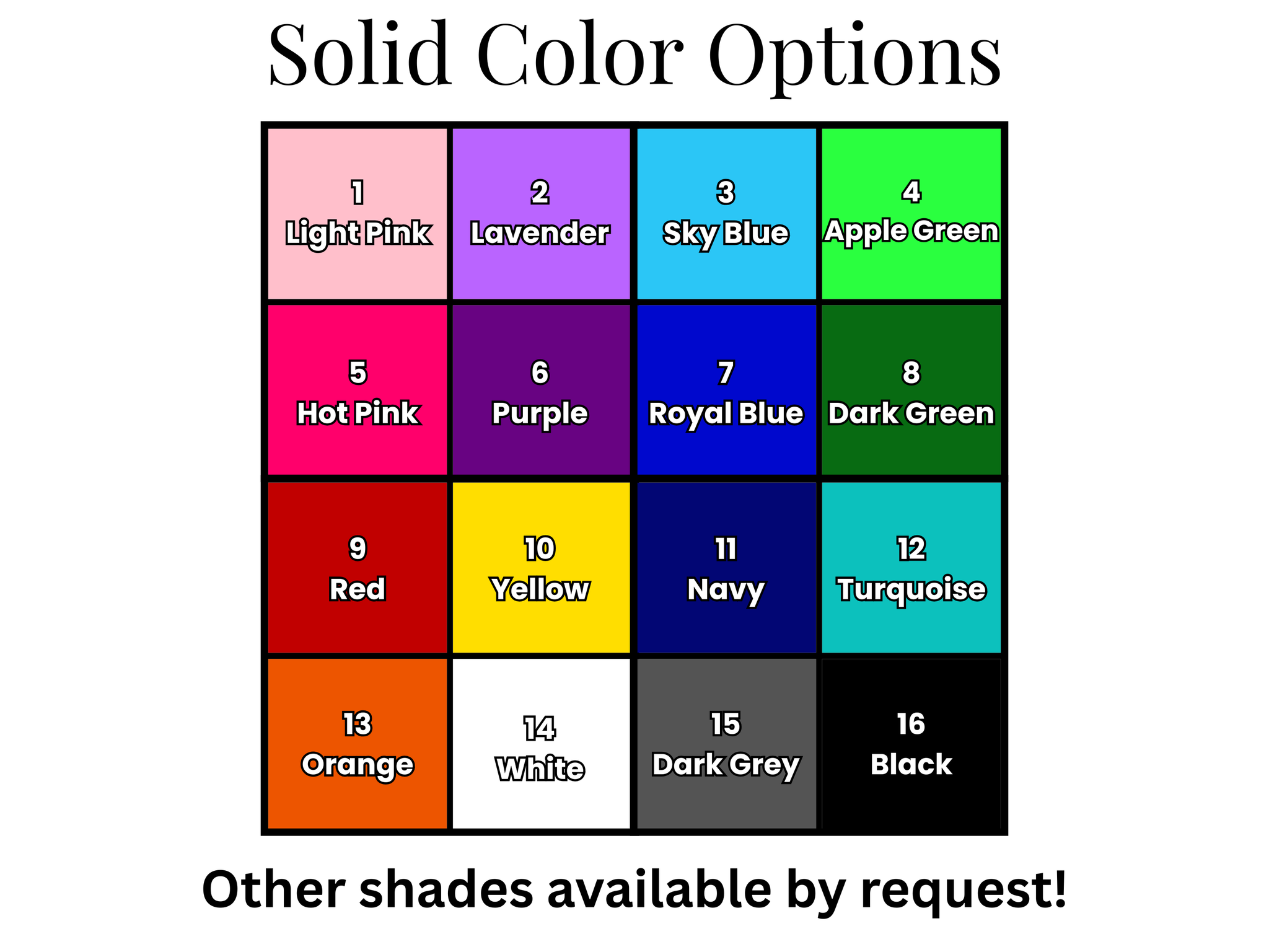 School colors, team colors, neon brights, or soft pastels. Add your choices in the personalization box. If you’d like specific colors, include that note at checkout!